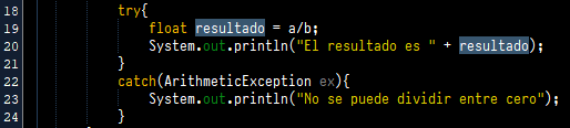 - Si b == 0. Se intenta ejecutar la línea 19 y el sistema tendrá un error en tiempo de ejecución lanzando una ArithmeticException. En este caso la línea 20 no se ejecutará y se pasará a ejecutar lo contenido en el catch. Es decir se ejecutará la línea 23 mostrando por pantalla el texto: «No se puede dividir entre cero».